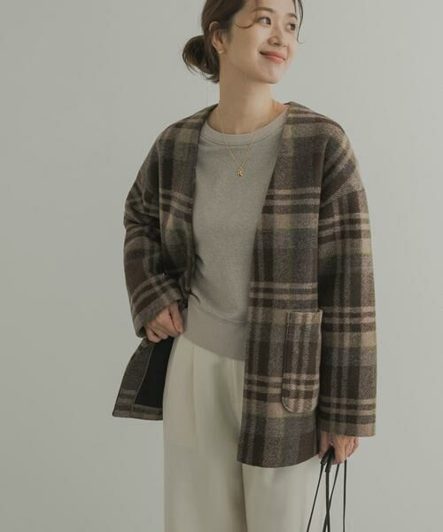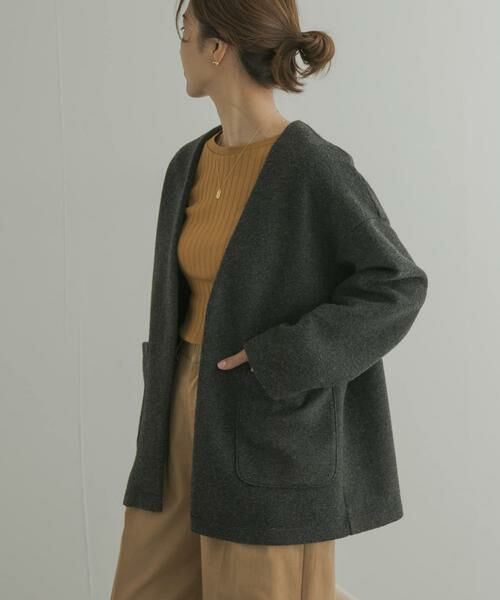 裏にボンディングを張り付け立体的に仕上げ、ソフトで軽く温かみのある素材は空気感があるので着心地よく、さらっとカーディガンのような感覚で羽織ることができます。