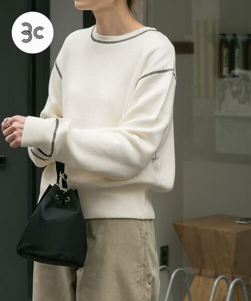 さりげない編地の変化と、バイカラーのステッチデザインがポイントのニットプルオーバー。