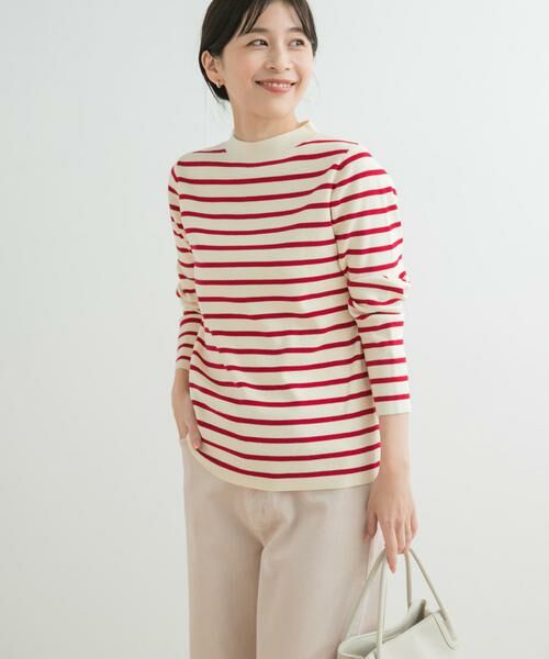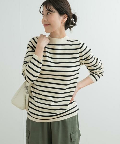 総針のしっかりした編地でカジュアルな印象のハイネックボーダーニットをご用意しました。