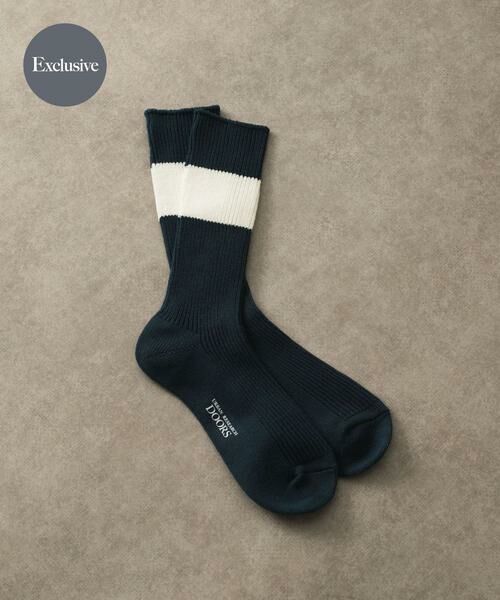 DOORS限定で展開されるAnonymous Ismとのコラボソックスは、柔らかく伸縮性のある素材で快適な履き心地を実現。シックなカラーリングと太めのストライプ柄が、カジュアルなスタイルにさりげないおしゃれをプラスします。