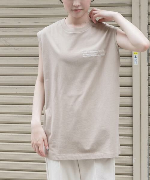胸元にあしらった配色のメッセージ刺繍が目を惹く一枚がノースリーブTシャツでも登場。