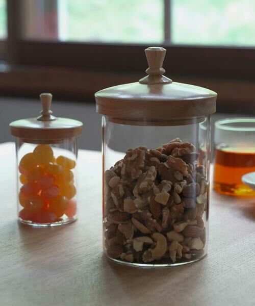 雑多に見えがちな食材や調味料などを整える木蓋付きのガラスジャーです。