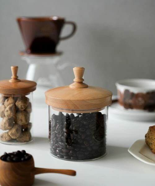 雑多に見えがちな食材や調味料などを整える木蓋付きのガラスジャーです。