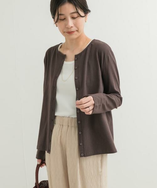 綿カスやフシなど、天然素材ならではの素朴な風合いを楽しめるカットソー天竺を使用した、シンプルなカーディガン。