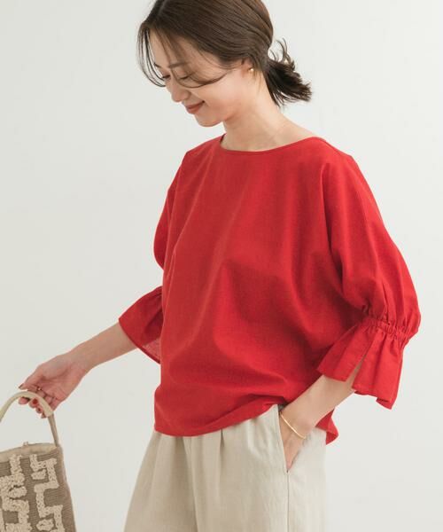 LサイズはWEBと一部店舗での取り扱いです。イージーケア・接触冷感・UVカット機能のついたポリエステル生地で夏に嬉しい機能が備わった高機能リネンを使用し、袖がキャンディのようにキュッと絞られたデザインが印象的なブラウスをご用意しました。
