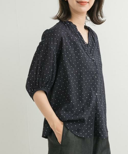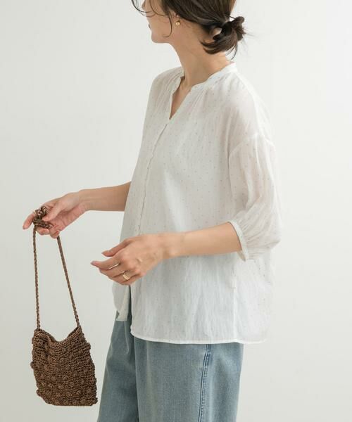 ドライタッチでシアー感のある軽やかな生地に、シルバーのグリッタードットプリントをあしらったブラウスは、涼しげで夏らしい印象を与えてくれる一枚。