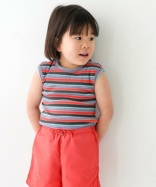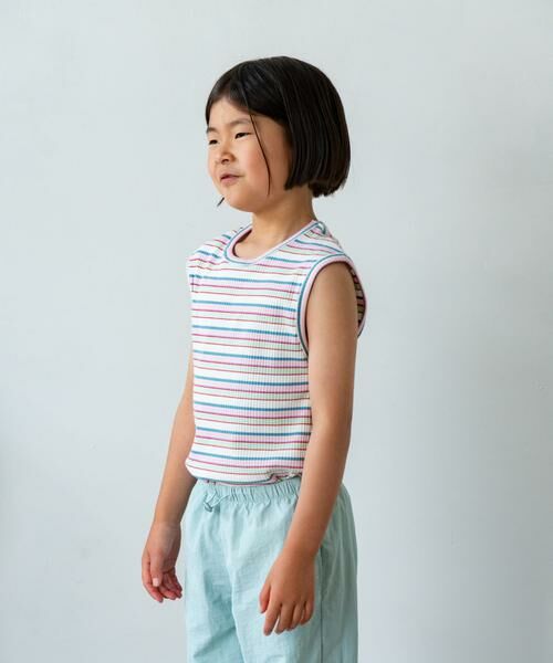 明るくポップな配色が目を引く、マルチストライプ柄のノースリーブトップス。夏らしい軽やかなデザインで、コーディネートの主役になる一枚です。素材は、伸縮性に優れたコットンリブを使用。肌にやさしく、着心地も抜群です。一枚でさらっと着られるデザイン。そのまま一枚で着るのはもちろん、ベスト感覚でTシャツやインナーとのレイヤードも楽しめる、スタイリングの幅が広がるアイテムです。リラックス感がありながらも、すっきりとしたシルエットで、カジュアルにも少しレトロにも着こなせます。同素材のMulti Stripe Shortsとセットアップでの着こなしもおすすめ。夏のお出かけやリゾートスタイルにぴったりです。もちろん、デニムやショーツなどとの相性も良く、着回し力の高いアイテムとして活躍してくれます。夏のワードローブに加えたい、華やかで実用的な一枚です。