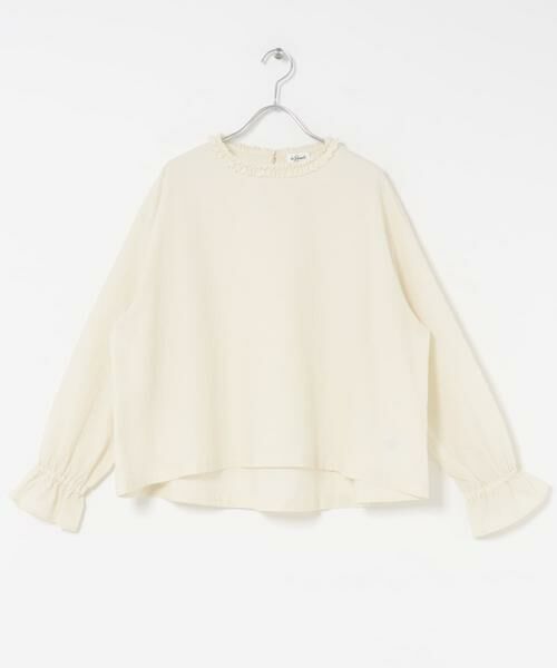 襟元のフリルがさりげないアクセントとなり、ギャザースリーブが柔らかな動きを演出。