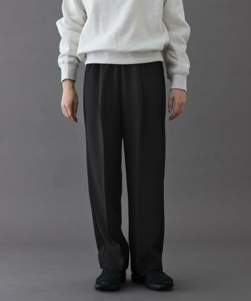 センタープレスを入れたストレートシルエットがすっきりとした印象をプラスしつつ、ウエストは総ゴムのイージー仕様にすることで気負いなくリラックスした着心地に。