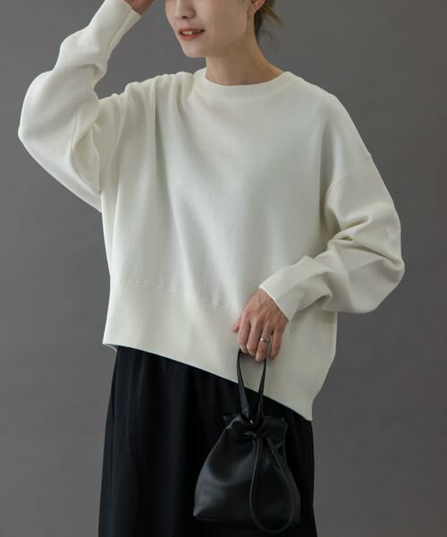 長くしすぎない着丈と少し前後差をつけたシルエットで微コクーンシルエットを演出し、シンプルながらもこなれた印象に。