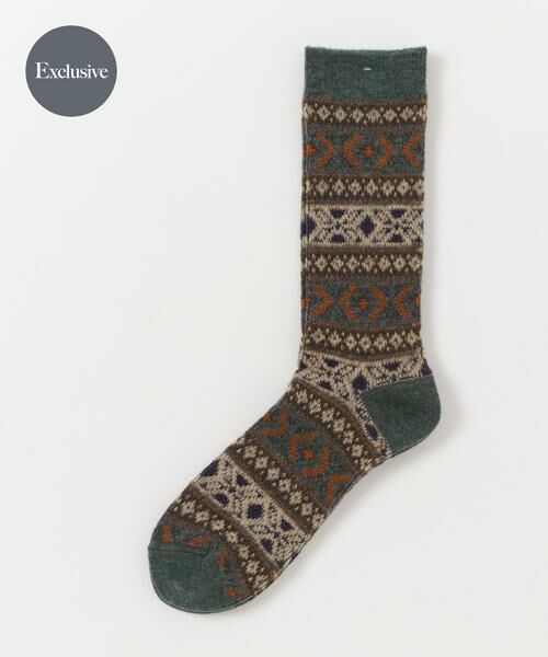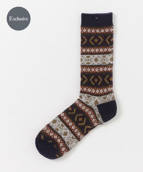 ウール混のジャガード編みで仕立てた、秋冬らしい深みのある柄のクルーソックスです。
