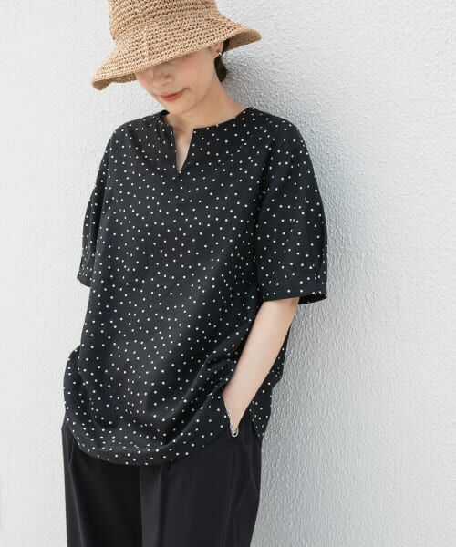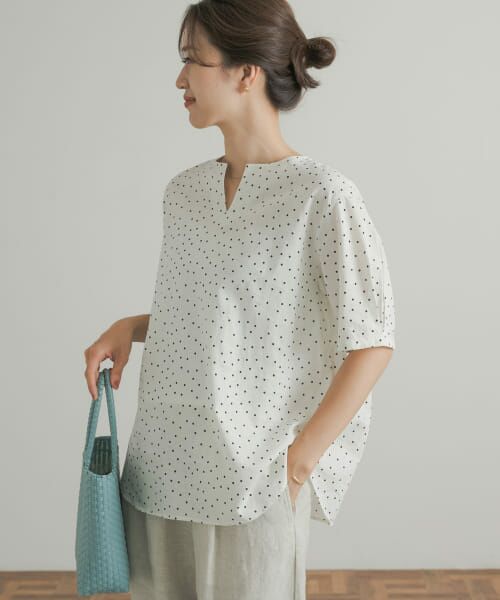 人気のドットプリントを清涼感のあるリネンコットン生地に載せたブラウスをご用意。