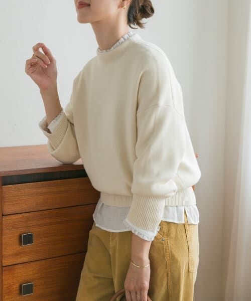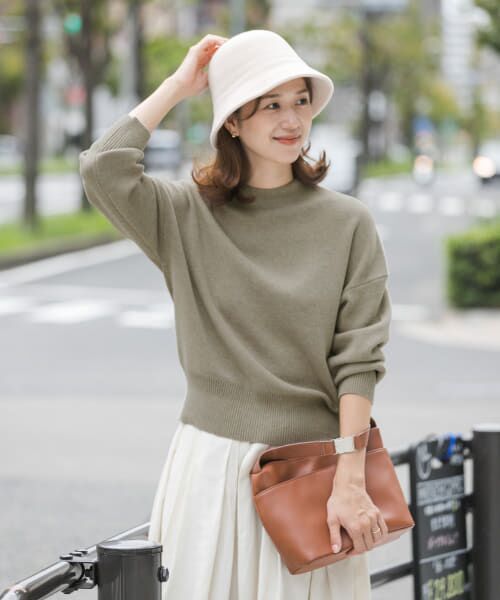 腰回りは太めのリブがスッキリとまとまりを出してくれるため、ワイドパンツやスカートにも相性良く、ボトムスの種類も選びません。