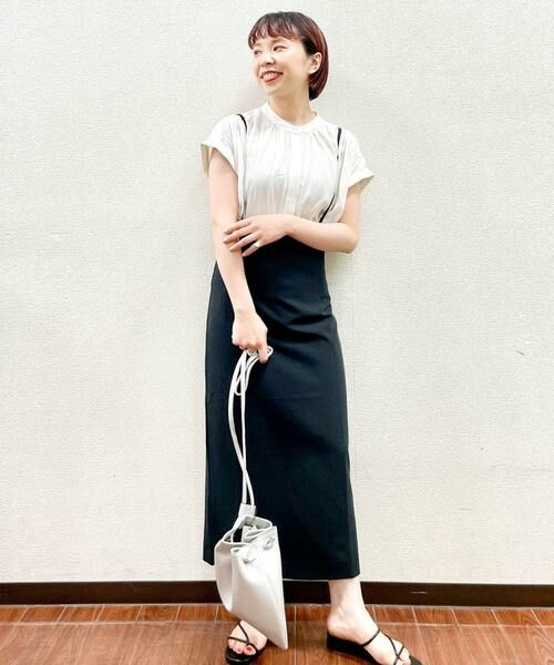 ややタイトめなデザインのサスつきスカートが登場!シンプルですっきりとしたデザインはカジュアルすぎず大人っぽさもありキレイめなスタイルにもハマる1着。バックにジッップの仕様なので、楽に脱ぎ履きができ、肩紐も調節可能となっております。