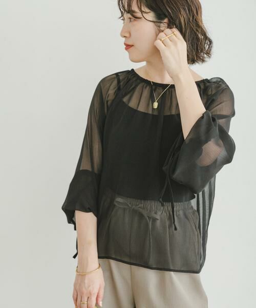 シーズンライクなストライプ柄のシアー生地で仕立てたブラウス。衿元にリボンを施し、フェミニンな印象でご着用いただけます。袖口にもリボンを施しているので、スタイリングや好みに合わせてバルーンスリーブのようなシルエットにしてご着用していただけます◎衿周りにたっぷりギャザーを施したボリュームのある1枚です。