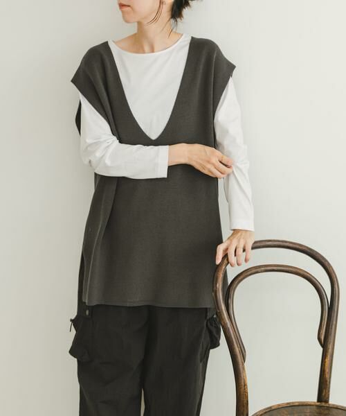 滑らかな素材で仕立てたVネックのニットベストとシンプルなクルーネックTシャツを組み合わせたセットアイテム。ベストはやや長めの着丈なので、気になるウエスト~ヒップ周りの体型カバーにも一役かってくれます。セットでの着用はもちろん、お手持ちのアイテムとのレイヤードスタイルもお楽しみいただけるので、スタイリングの幅が広がること間違いなしですよ◎