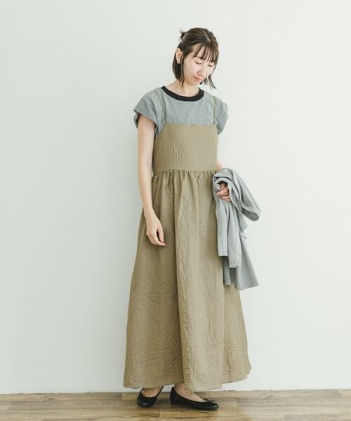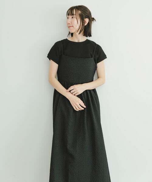 ウエスト部分にギャザーを施した切替デザインのキャミワンピース。まるでビスチェを着用しているようなこだわりのバックディテールが可愛い1着です。ポコポコとした表情のある生地で仕立てているので、長時間の着用でもシワが気にならないのも嬉しいポイントです。