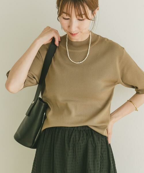 程よい厚みときちんと感のある総針編みの半袖ニット。無地でシンプルなデザインながら、五分袖と開きすぎないネックラインが上品な印象を与え、1枚で大人の落ち着いたスタイルが完成します。また、体のラインを拾いにくく、さらっと着るだけでサマになるので、カジュアルにもきれいめにも合わせやすく、デイリーに活躍する万能ニットです。