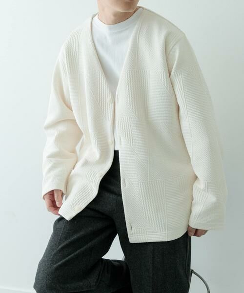ジオメトリック柄ながら、同系色でまとめることで主張し過ぎず、程よいアクセントでコーディネートをまとめてくれます。