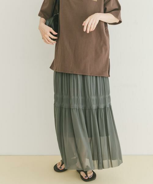 軽やかで女性らしい印象のチュールシャーリングスカート。ウエストはゴム仕様でラクな履き心地ながら、ギャザーが程よく広がり、ボリュームが出すぎない上品なシルエットに仕上がっています。裾にはシアー感があり、動くたびにふんわりと揺れるデザインが魅力。スニーカーと合わせてカジュアルに、パンプスを履けばきれいめコーデにもぴったり。普段使いからお出かけまで幅広く活躍する、1枚あると便利なスカートです。