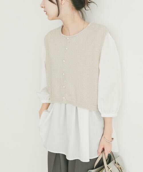 ふんわり重ねて、やさしい抜け感を。ニットベストと布帛ブラウスをドッキングした、レイヤード風チュニックトップス。異素材が織りなす立体感と、ほんのり広がるフレアなシルエットが、やわらかなムードを演出します。ヒップラインまで自然に隠れるチュニック丈で、気になる部分はさりげなくカバー。きれいめボトムとも相性がよく、シンプルながらも上品に映える一枚です。【2025 Spring/Summer】【25SS】総重量 : 約330g※商品画像は、光の当たり具合やパソコンなどの閲覧環境により、実際の色味と異なって見える場合がございます。予めご了承ください。※商品の色味の目安は、商品単体の画像をご参照ください。▼お気に入り登録のおすすめ▼お気に入り登録商品は、マイページにて現在の価格情報や在庫状況の確認が可能です。お買い物リストの管理に是非ご利用下さい。