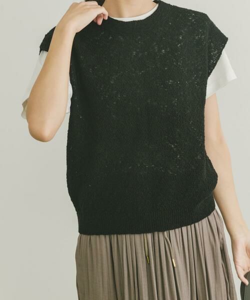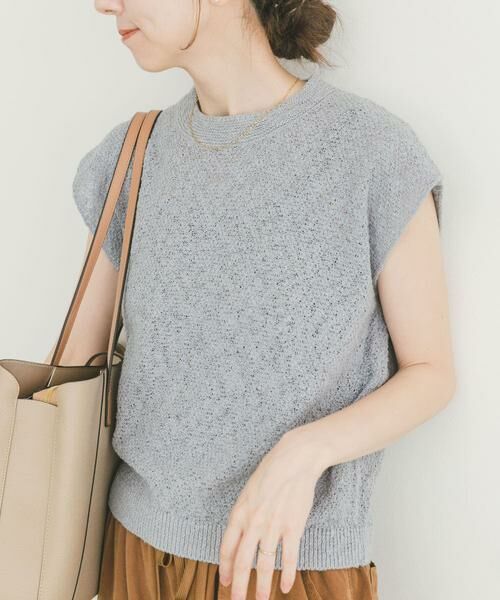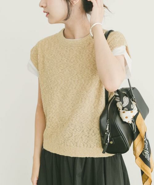 シャリ感のあるゴムヤーン素材が肌離れよく、今の時期はノースリーブやタンクトップに重ねても、単品で着ても涼しくかわいく着られます。