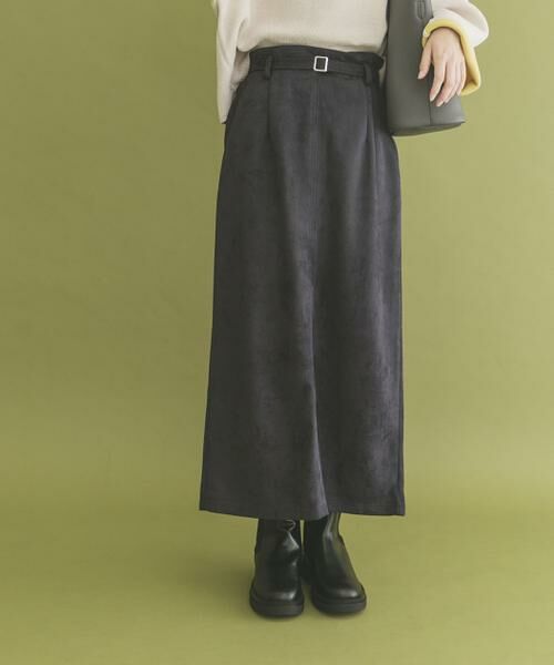 ウエストベルトのデザインがさりげないアクセントになり、きれいめスタイルをぐっと格上げするフェイクスエードスカート。