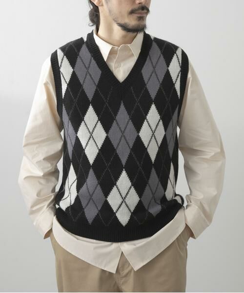 ウールを使用したニットベストは、クラシックなアーガイル柄をあえてモダンにアレンジ。落ち着いたトーンと柔らかな風合いで、シャツやカットソーとのレイヤードも都会的に決まります。程よいゆとりのあるシルエットは着心地も快適で、カジュアルにもきれいめにも対応。1枚取り入れるだけで、シンプルなコーデを洗練された印象にアップデートしてくれる、大人のデイリーベストです。