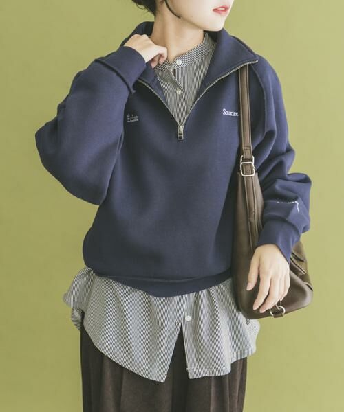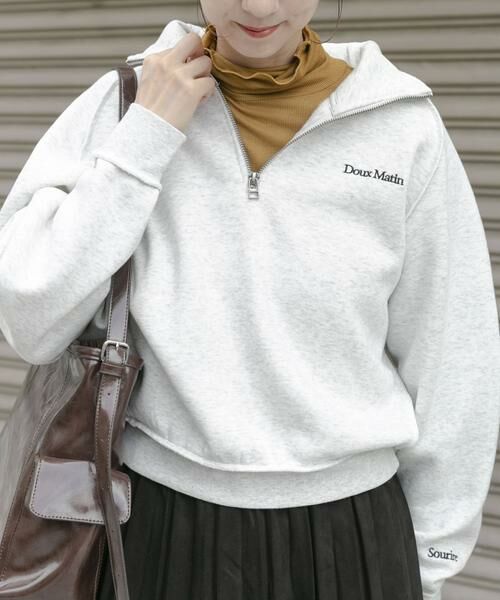 胸元にあしらった小さな刺繍ロゴが、上品なアクセントを添えるハーフジップスウェット。トレンド感のあるショート丈は、ハイウエストボトムと好相性でスタイルアップ効果も抜群。ほどよいゆとりのあるシルエットが抜け感を生み、大人のカジュアルスタイルを格上げします。ジップの開け方次第で雰囲気を変えられ、デイリーにもお出かけにも活躍する一枚です。
