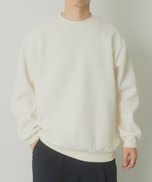 ケーブル柄が立体的な印象を与え、単品でもレイヤードでも映えるデザインです。