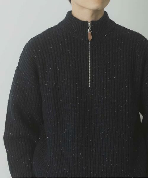 胸元にさりげないアクセントを与えるハーフジップ仕様が特徴のモックネックニット。