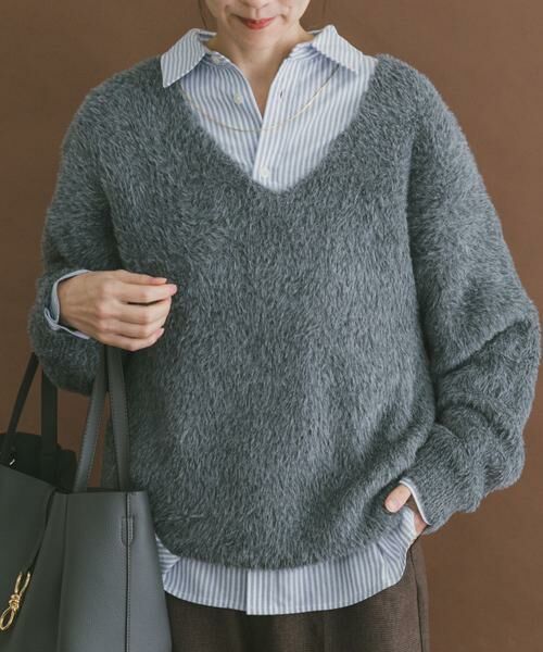 シャギー素材が、見た目にも触り心地もふわふわと柔らかい、癒しの一枚。深すぎないVネックがデコルテを美しく見せ、女性らしい抜け感を演出します。着るだけで気分が上がる、秋冬の主役級ニット。インナーを重ねれば、トレンド感のあるレイヤードも楽しめます。幅広いコーディネートに活躍する、上品で大人かわいいシャギーニットです。