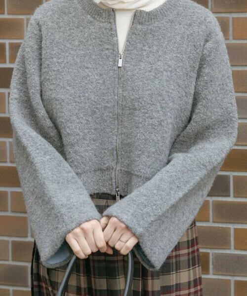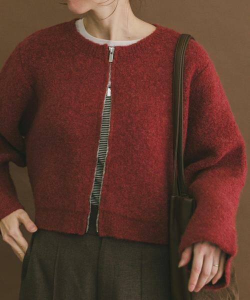 毛足が長くふんわり柔らかなブークレ素材が、見た目にもあたたかく優しい印象のクロップド丈カーディガン。ジップアップ仕様でさっと羽織れるのも嬉しいポイントです。裾がきゅっと締まったショート丈は、ハイウエストのボトムと合わせると脚長効果も。レイヤードスタイルもバランスよく決まり、メリハリのある着こなしに仕上がります。ボリューム袖のトップスの上からもすっきり羽織れ、軽めのアウターとしてはもちろん、ジャケットやコートのインナーとしても活躍する、シーズン通して頼れる一枚です。