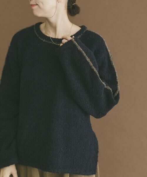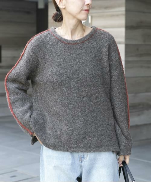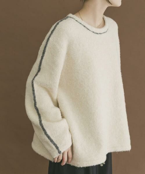 程よくゆとりのあるオーバーサイズシルエットで、トレンド感とリラックスした着心地を両立。ごわつきが少なく、アウターのインナーとしても活躍する一枚です。カジュアルなデザインながら、ブークレ素材ならではの温かみある豊かな質感が上品さを添えます。落ち着いたトーンの本体に、袖とネックラインのパイピング配色がさりげないアクセントをプラスし、着こなしに深みと奥行きを演出します。