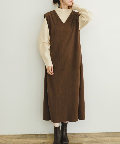 しっとりとした柔らかいコーデュロイ生地で仕立てたジャンパースカート。両サイドにタックを施しているので、重ね着をしてもストレスフリーなゆったりとした着心地に◎Aラインながら広がりすぎず、スッキリとしたシルエットで着用いただけます。シャツ・ブラウスやニットなど、インナー次第で多彩な着回しをお楽しみいただけるオススメの1着です。