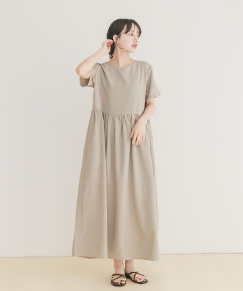 ナチュラルな風合いが魅力のリネンライク半袖ワンピース。ウエストギャザー入りでふんわりと立体感のあるシルエットながら、締め付け感がなく、ゆったりとした着心地が魅力です。シンプルなデザインで、スニーカーやサンダルと合わせてカジュアルに、パンプスやアクセサリーをプラスすればきれいめスタイルにも◎さらに、イージーケア・吸水速乾・接触冷感・UVカット機能付きで、暑い日のお出かけや旅行にもぴったり。着るだけでおしゃれが決まる、夏に頼れる一枚です。