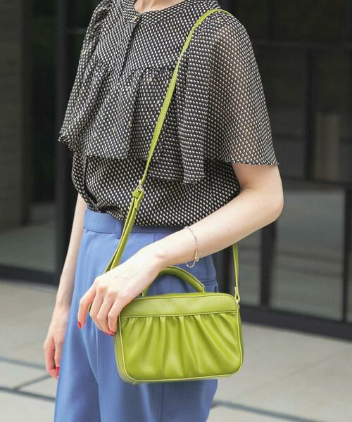 ミニマムなサイズ感で仕上げた、スクエア型のハンドバッグ。シンプルながらも表面のギャザーデザインが、女性らしさを演出します。ストラップ付きのため、肩掛けにも対応が可能◎内側には仕切りポケットがあり、小物を分けて収納できるのも嬉しいポイント。デイリー使いから、ちょっとしたお食事シーンにも活躍する優秀バッグです。