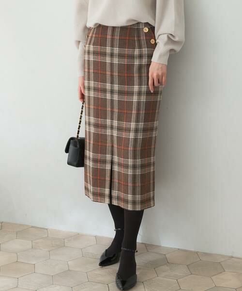 ポケット横に付けたマットゴールド釦が、大人クラシカルな雰囲気に仕上がるスカート。Iラインシルエットに、センタースリットを施すことで抜け感をプラスしたデザインです。単色は凹凸感のあるミックスカラーの糸で設計した、ネップツイードのようなデザインを表現。CHECK柄は、秋冬らしいシーズンムード高まるデザインに仕上げました。トレンドライクなショート丈トップスや、ロングブーツとの着こなしが今季はお勧め。