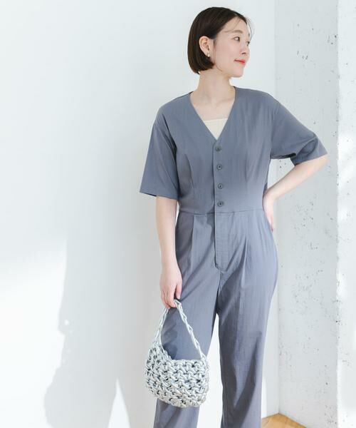 リラックス感抜群の、女性らしく着こなせるオールインワン。デコルテを綺麗に魅せるVネック仕様でご用意しました。長めの股上デザインは、ボディラインを拾いにくく体型カバー効果も◎フロント釦とヒップのポケットデザインがこなれ感を演出します。ナイロン生地のハリ感がシルエットをキープし、旬コーデが完成する一着に。