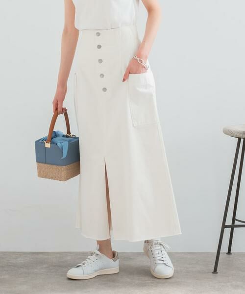 フロント釦×ポケットデザインが魅力のデニムスカート。ほんのりAラインシルエットで、女性らしい抜け感を演出します。ウエストラインが細く見えるハイウエスト仕様は、トップスインやショート丈トップスと相性抜群◎前に深めスリットを施し、足さばきの良いデザインに仕上げました。裾はカットオフで仕上げ、細部のディテールまでこだわった優秀な一着に。