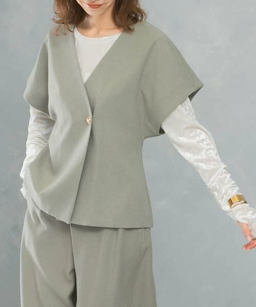 こなれたレイヤードスタイルが完成するVネックベスト。首元はすっきりとしたVネック仕様となっており、コンパクトな着丈でマニッシュな雰囲気に仕上げます。肩にかかるお袖デザインは、気になる二の腕もカバーする仕様に◎さり気ないフロント釦デザインもポイントで、アクセサリーいらずの華やかな印象を演出します。同素材の(商品番号:RA46-24S605)とのセットアップスタイルもお勧め。
