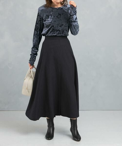 トレンドのピンストライプを採用した、シャープな印象のロングスカート。歩くたびドラマティックに揺れる、贅沢なフレアシルエットでご用意しました。エレガント過ぎず適度なラフさと品の良さがあるので、デイリーのみならず通勤スタイルにもお勧め。着こなしに馴染む落ち着きのある配色で、便利な両サイドポケットもお作りしました。