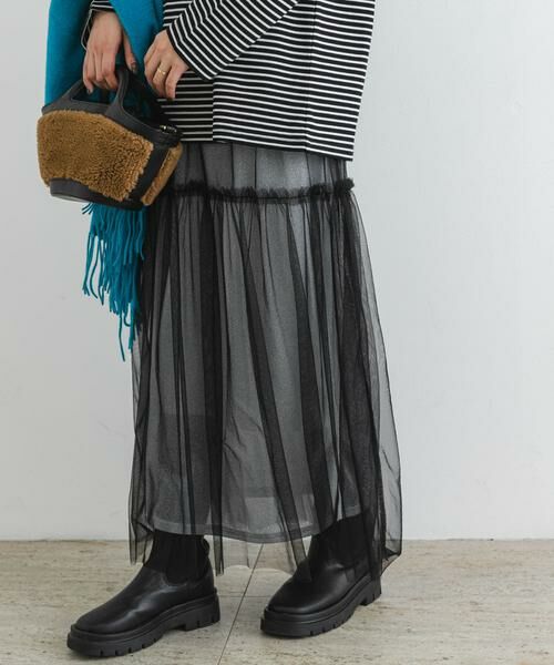 繊細なラメの表情が着映えを叶える、ティアードスカートが新登場。ラメ地のストレートスカートに、チュール素材のティアードスカートをレイヤードしたような一着です。ウエストはゴム仕様のため、リラクシーな着心地を実現◎裾のティアード切り替え位置をヒップ下に近づけ、甘い印象にならないようバランスにも拘りました。カットソーからローゲージニットまで、シーズン長く活躍する優秀アイテムに。