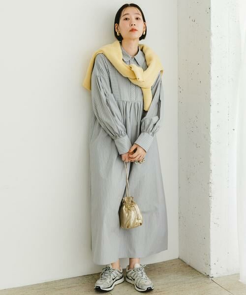 春らしいカラーの配色に、ストライプ地で仕上げた大人クラシカルなシャツワンピース。裾に向かって広がるフレアシルエット×細部にギャザーデザインを施し、たっぷりとボリューム感を表現しました。切り替え位置に施した、ゴールドのロゴチャームも魅力ポイント◎しっかり長さがあるロング丈も、足首が見える丈感に設定しすっきり見えを叶えます。ボタンを少し開いた抜け感漂う着こなしや、寒い時期はタートルネックとのレイヤードスタイルもお勧め。