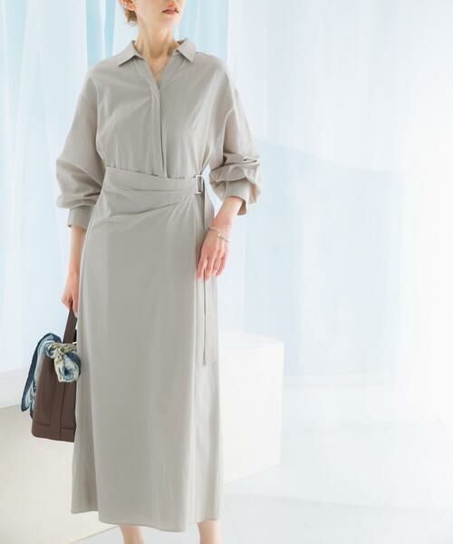 スキッパー衿の抜け感とギャザーボリュームのお袖が女性らしいワンピースが登場。広がりすぎないラップデザインのスカートとベルトの金具デザインは、綺麗めシーンでも活躍してくれます。きちんと見えポイントは押さえつつ、後ろウエストはゴム仕様のためリラクシーな着心地を実現。綿混のシャツ地ながら微光沢がある素材のため、一枚で様になるワンピースです。