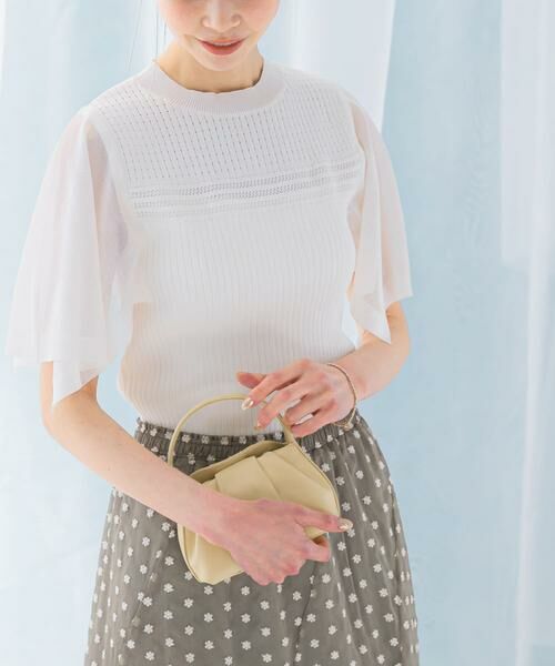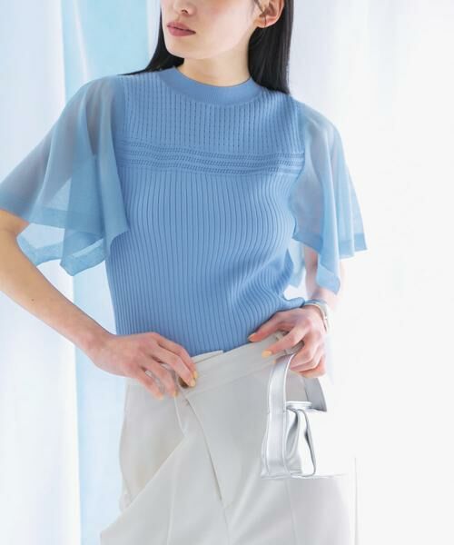 ノースリーブのリブニットに、着映えするハンカチスリーブを加えたサマーニットが新登場。シアー糸で切り替えた袖デザインが、女性らしい印象を叶えます。ニットの網目幅を変化することで、デザインにアクセントをプラス。身頃はストレッチ性のあるリブデザインで、着心地も抜群です。ボリュームのあるスカートと合わせて大人フェミニンに、綺麗めパンツとのバランスの取れた着こなしもお勧め。