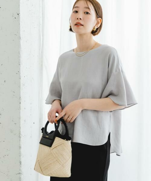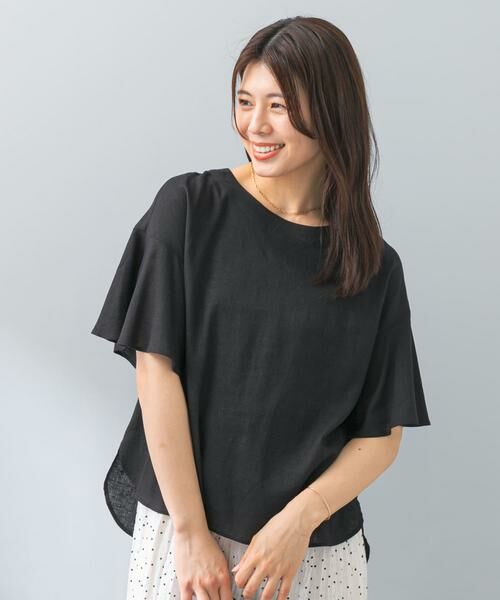 ナチュラルな風合いが魅力のリネン素材で仕立てた、涼しげな一枚。前はすっきりと、後ろはVカットのデザインで抜け感をプラスしました。さりげなく揺れるフレアスリーブが、女性らしい印象に。裾は丸みのあるラウンド仕様×ボックスシルエットになっており、一枚でバランスよく着用できます。インでもアウトでも決まる丈感のため、幅広いボトムスと好相性のアイテムに。