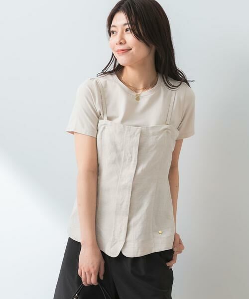 ナチュラルな風合いが魅力のリネン混素材のビスチェと、半袖Tシャツのセットアイテム。ビスチェの肩紐は取り外せる2WAY仕様で、ゴールドのアジャスターが女性らしさをプラスします。フロントのボタンが見えない仕様で、シンプルですっきりとした印象に。コンパクトなシルエットなので、ジャケットやシャツのインナーとしても使える、着回し力抜群の一着です。
