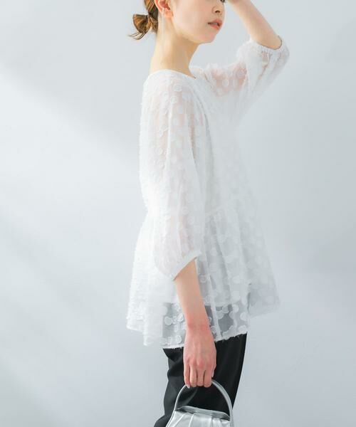 さり気ないラメ糸がミックスされた、一枚で着映えるジャガードペプラムブラウスが登場衿元や袖口はサテンの別地を使用し、高級感のあるディテールに拘りました。ドットを散りばめたような華やかなジャガードは、表情豊かな立体感のある仕上がりに。スリムなテーパードパンツやタイトスカートとの、バランスの取れたスタイリングがお勧め。アクセサリーやブローチを添えて、お食事・オケージョンシーンにも着用頂けます。