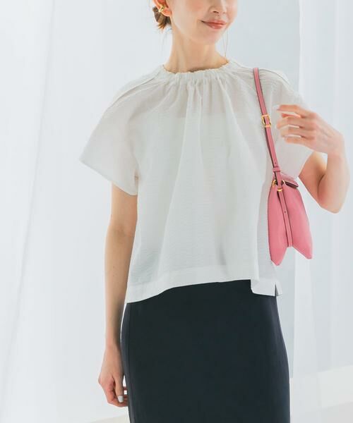 【襟元のギャザーがほんのり甘さのある涼感ショートブラウス】